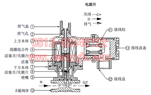 輸入電壓信號,線圈產生電磁場,活塞(⑥)上升,同時噴嘴(⑨)脫離活塞(⑥)的下部產生通路,進氣口的氣壓通過這個通路向出氣口流出。當切斷信號電壓時,活塞(⑥)向下運動,堵住通路,切斷氣壓。同時出氣口的壓力通過活塞(⑥)內部通路流向排氣口(②),并通過排氣蓋(①)向大氣排出。
