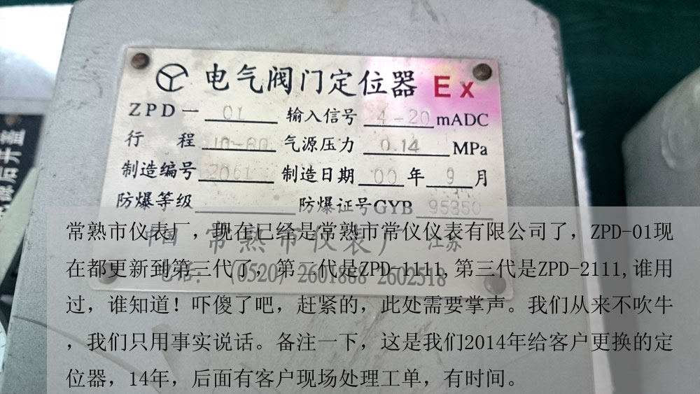 常熟市儀表廠,現(xiàn)在已經(jīng)是常熟市常儀儀表有限公司了,ZPD-01現(xiàn)在都更新到第三代了,第二代是ZPD-1111,第三代是ZPD-2111,誰(shuí)用過(guò),誰(shuí)知道!嚇傻了吧,趕緊的,此處需要掌聲。我們從來(lái)不吹牛,我們只用事實(shí)說(shuō)話。備注一下,這是我們2014年給客戶更換的定位器,14年,后面有客戶現(xiàn)場(chǎng)處理工單,有時(shí)間。