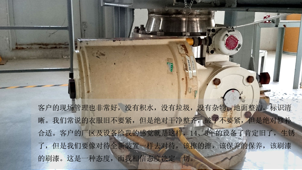 客戶的現(xiàn)場(chǎng)管理也非常好,沒(méi)有積水,沒(méi)有垃圾,沒(méi)有雜物,地面整潔,標(biāo)識(shí)清晰。我們常說(shuō)的衣服舊不要緊,但是絕對(duì)干凈整齊,破了不要緊,但是絕對(duì)修補(bǔ)合適。客戶的廠區(qū)及設(shè)備給我的感覺(jué)就是這樣,14、5年的設(shè)備了肯定舊了,生銹了,但是我們要像對(duì)待全新裝置一樣去對(duì)待,該擦的擦,該保養(yǎng)的保養(yǎng),該刷漆的刷漆。這是一種態(tài)度,而我相信態(tài)度決定一切。