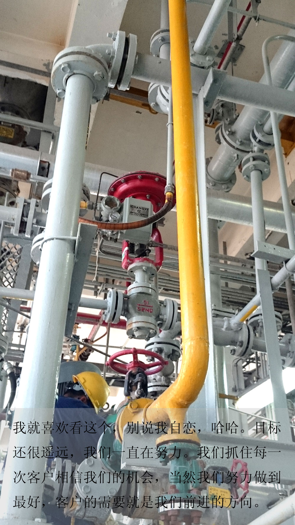 有種藝術(shù)叫管線,有種美叫工業(yè),有種細(xì)心叫工藝,每一個(gè)管線,每一個(gè)螺絲,每一種物料,這都是經(jīng)過(guò)計(jì)算,實(shí)驗(yàn),都是通過(guò)時(shí)間,壓力,溫度設(shè)計(jì)好的,知識(shí)量大嗎?大,真大,有時(shí)真的超出我們個(gè)體的腦容量。所以我們才需要團(tuán)隊(duì),需要不同的人,專攻不同的專業(yè)方向。我們努力做好我們的常儀閥門(mén)定位器。
