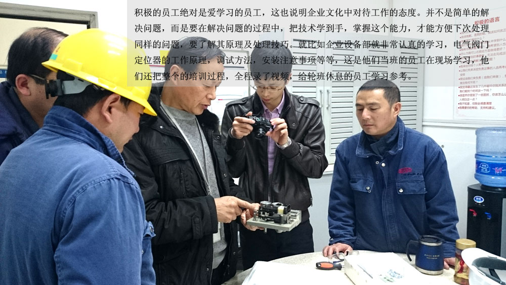 積極的員工絕對(duì)是愛(ài)學(xué)習(xí)的員工,這也說(shuō)明企業(yè)文化中對(duì)待工作的態(tài)度。并不是簡(jiǎn)單的解決問(wèn)題,而是要在解決問(wèn)題的過(guò)程中,把技術(shù)學(xué)到手,掌握這個(gè)能力,才能方便下次處理同樣的問(wèn)題,要了解其原理及處理技巧。就比如企業(yè)設(shè)備部就非常認(rèn)真的學(xué)習(xí),電氣閥門(mén)定位器的工作原理,調(diào)試方法,安裝注意事項(xiàng)等等,這是他們當(dāng)班的員工在現(xiàn)場(chǎng)學(xué)習(xí),他們還把整個(gè)的培訓(xùn)過(guò)程,全程錄了視頻,給輪班休息的員工學(xué)習(xí)參考。