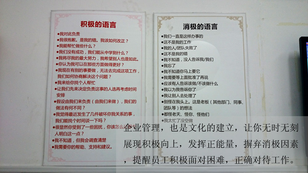 企業(yè)管理,也是文化的建立,讓你無(wú)時(shí)無(wú)刻展現(xiàn)積極向上,發(fā)揮正能量,摒棄消極因素,提醒員工積極面對(duì)困難,正確對(duì)待工作。