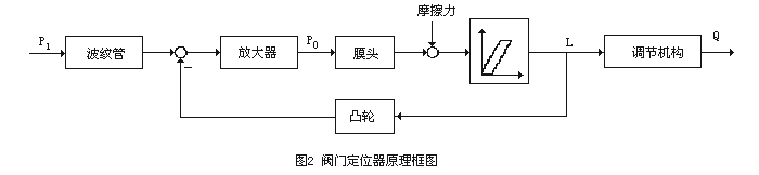 使用閥門定位器后,輸入信號先進入波紋管1,使杠桿2靠近噴嘴3,噴嘴的背壓增大,經放大器4后輸出的信號送膜頭5,閥桿移動的反饋信號經連桿傳遞,轉換為凸輪6的轉動,并使杠桿2離開噴嘴3,達到新的平衡點,如果閥桿與輸入信號不對應,則在負反饋作用下,會改變進入膜頭的氣壓,直到新平衡點建立。圖2是閥門定位器的原理框圖。可以看到,這是一個負反饋控制系統,除反饋信號直接來自閥桿外,與氣動壓力變送器的部分結構十分相似。電氣閥門定位器的工作原理與氣動閥門定位器也很相似,但輸入信號是電信號,其工作原理與電動壓力變送器也十分相似。