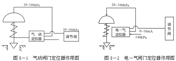 許多設(shè)計人員通常以4-20mA信號作為信息信號,而不采用功率信號。對于薄膜式執(zhí)行器,功率信號不僅決定了關(guān)閉部件的定位位置,而且也可以驅(qū)動接通運行氣源,關(guān)閉閥門。當(dāng)標(biāo)定閥門時,閥門處于關(guān)閉狀態(tài)時,信號值恰好為4mA。為確保不產(chǎn)生閥座負(fù)荷,閥門設(shè)計中應(yīng)用了輔助電源。只有當(dāng)控制信號下降到4mA以下時,才會產(chǎn)生閥座負(fù)荷,但是控制系統(tǒng)中通常不會存在這種信號。因此,討論本問題的目的僅是進(jìn)行標(biāo)定,以使閥門準(zhǔn)確嚴(yán)密關(guān)閉;當(dāng)關(guān)閉時,閥座處于全負(fù)荷狀態(tài)。當(dāng)信號值為運行值的3-5%時,進(jìn)行非正常標(biāo)定,使閥門在閥座上就位。或當(dāng)閥門的行程達(dá)到預(yù)置位置時,快速動作繼電器改變定位器信號,使閥門完全關(guān)閉,施加全負(fù)荷閉合壓力。 閥門定位器是調(diào)節(jié)閥的主要附件,它與調(diào)節(jié)閥配套使用,接受調(diào)節(jié)器的輸出信號,然后以它的輸出信號去控制調(diào)節(jié)閥,當(dāng)調(diào)節(jié)閥動作后,閥桿的位移又通過機(jī)械裝置反饋到閥門定位器,因此,這種定位器和調(diào)節(jié)閥組成一個閉環(huán)回路,如圖8-1和圖8-2所示。