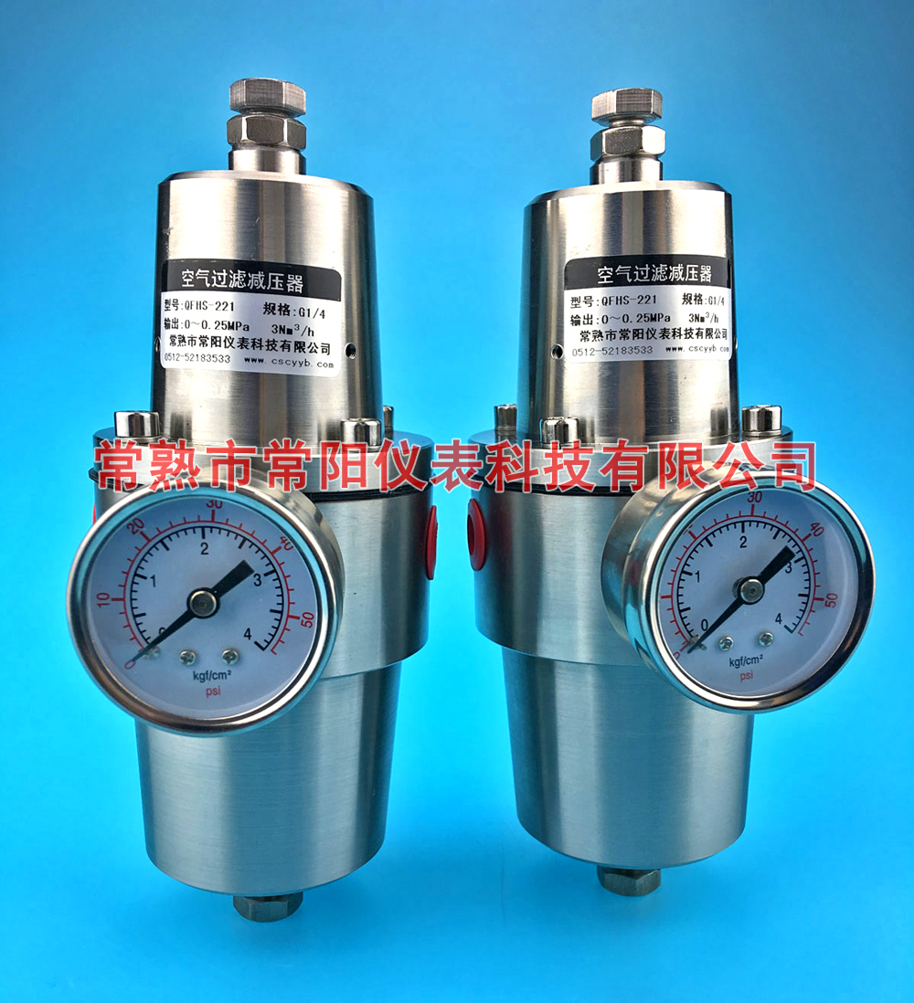 (圖為常陽生產的QFHS不銹鋼型空氣過濾減壓閥,是一種高性能防腐性產品,它將來自空壓機0.3~1MPa的空氣壓力經過濾凈化后可調節在0~(0.16~0.6MPa)范圍內任一輸出值,保持壓力穩定,適用于儀表供給壓力和動力風壓的穩定裝置。其材質選用優質S304不銹鋼材,具有防腐功能) 二、減壓閥的基本性能 (1) 減壓閥調壓范圍:它是指減壓閥輸出壓力P2的可調范圍,在此范圍內要求達到規定的精度。調壓范圍主要與調壓彈簧的剛度有關。 (2) 減壓閥壓力特性:它是指流量g為定值時,因輸入壓力波動而引起輸出壓力波動的特性。輸出壓力波動越小,減壓閥的特性越好。輸出壓力必須低于輸入壓力—定值才基本上不隨輸入壓力變化而變化。 (3) 減壓閥流量特性:它是指輸入壓力—定時,輸出壓力隨輸出流量g的變化而變化的持性。當流量g發生變化時,輸出壓力的變化越小越好。一般輸出壓力越低,它隨輸出流量的變化波動就越小。 三 、減壓閥的選用 根據使用要求選定減壓閥的類型和調壓精度,再根據所需最大輸出流量選擇其通徑。決定閥的氣源壓力時,應使其大于最高輸出壓力0.1MPa。減壓閥一般安裝在分水濾氣器之后,油霧器或定值器之前,并注意不要將其進、出口接反;閥不用時應把旋鈕放松,以免膜片經常受壓變形而影響其性能。 |