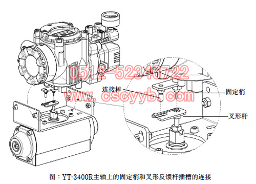 6.把YT-3400R安裝在支架上。YT-3400R放置在支架上方時,YT-3400R的主軸下面的固定梢對準叉形桿上方的中心孔內,同時把主軸反饋桿上的連接棒插入到叉形桿的插槽。這是為了讓YT-3400R的主軸和氣缸軸的中心一致,如果中心沒有對準,那么YT-3400R的主軸上產生負荷力,影響產品的內構成,因此請正確對準中心。