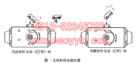 4.確認執行機構軸的回轉方向后,設定為起始點后,如圖安裝叉形桿。請注意順時針和反時針旋轉時起始點的位置。叉形桿的安裝角度得跟水平軸成45度。NAMUR桿時沒有關系。