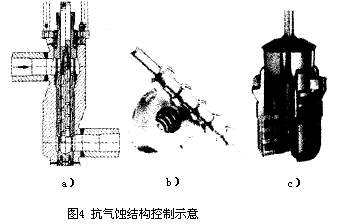 在圖4中a)、b)為多級軸結構閥門,c)是一種采用新型AC-TRIM技術的抗氣蝕結構的閥門,它克服了其他一些廠家同類產品例如迷宮閥,多通路閥易堵的缺點,閥座、閥芯密封面采用專利技術,具有高XFZ值,根據需要在閥座腔內還可選配1到4組降壓孔板(一般針對口徑在3″~6″范圍內,1″=25.4mm),此外,閥桿下導向具有很好的抗振效果。根據IEC534/VDMA24422標準,可利用如下判式對氣蝕發生與否及閥門磨損情況進行分析。